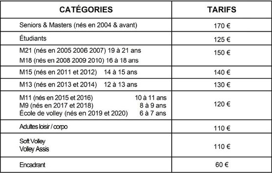 • le règlement correspondant à votre catégorie, par chèque bancaire (règlement échelonné autorisé – indiquer les dates de débit au dos des chèques) à l’ordre de Concarneau Volley, ou par espèces.